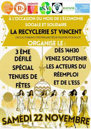 Venez nombreux soutenir les acteurs de l'économie sociale et solidaire en assistant au défilé "spécial tenues de fêtes" de la Recyclerie St Vincent dès 14h30, puis ouverture du showroom où vous pourrez acheter les tenues que vous aurez vu lors du défilé.Solidairement !